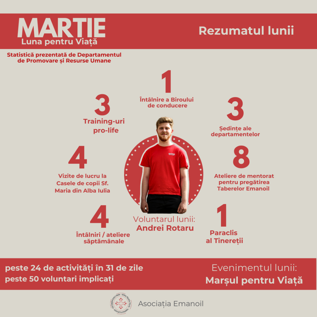 Peste 24 de activități au implicat peste 50 de voluntari Emanoil într-o lună întreagă de jertfă și devenire personală. La finalul acestei luni, este înununat, pentru eforturi, dăruire și zecile de ore oferite, voluntarul Andrei Rotaru, ambasador pro-viață și voluntar Emanoil.