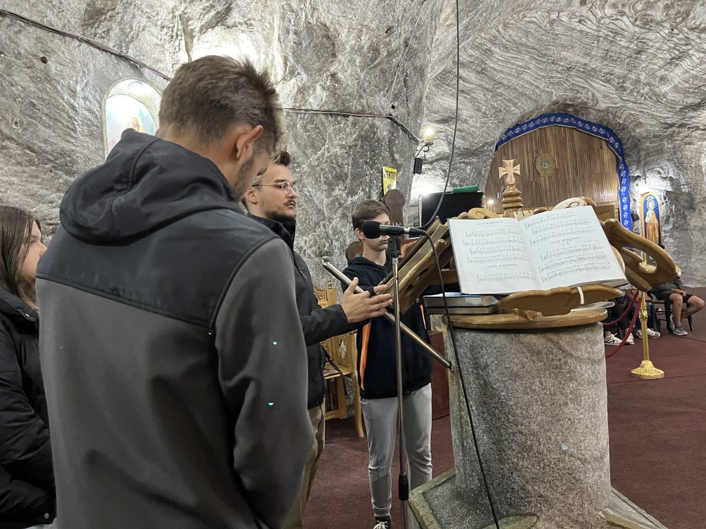 Un moment inedit al deplasării noastre aici a însemnat slujirea Sf. Liturghii într-un context deosebit. În măruntaiele pămânului, în salina de la Târgu Ocna, există o Catedrală de sare, lucrată manual de către minerii de-aici și dedicată Sf. Varvara, ocrotitoarea minerilor. Am putut să ne împărtășim cu Sf. Taine, să oferim răspunsurile la strană și să încununăm în cel mai firesc mod aceste zile frumoase.